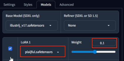이제 plaijful.safetensors로 LoRA를 적용하고 원하는 웨이트로 지정합니다.