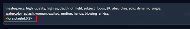 LoRA 지정의 또 다른 방법으로는 아래와 같이 <lora:plaijful:0.9>를 프롬프트에 직업 입력하여 원하는 LoRA를 활성화 하는 방법도 있어요. 이기서 0.9는 웨이트 값이겠죠. 또 다른 방법으로는 Trigger Words로도 LoRA를 활성화 할 수도 있어요.