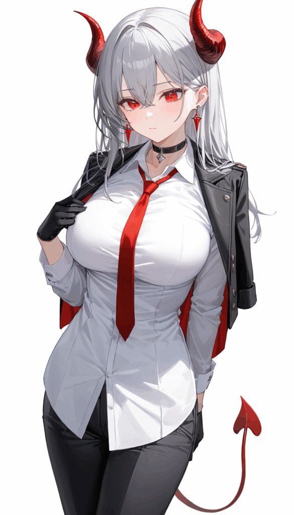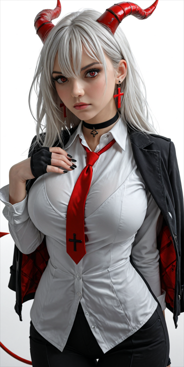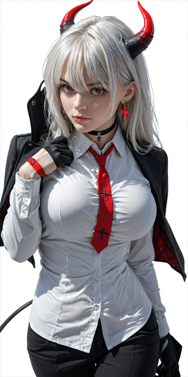 an anime woman with horns and long white hair, 1girl, solo, long hair, breasts, looking at viewer, bangs, large breasts, simple background, shirt, red eyes, gloves, long sleeves, white background, hair between eyes, jewelry, closed mouth, standing, jacket, tail, white shirt, white hair, grey hair, cowboy shot, earrings, necktie, horns, choker, black gloves, collared shirt, pants, hand up, black jacket, black choker, black pants, demon girl, cross, red necktie, demon horns, demon tail, jacket on shoulders, red horns, cross earrings