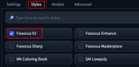 스타일 탭에서 Fooocus V2만 체크 하거나 모두 체크 해제해 주세요. 불필요한 스타일 프롬프트가 이미지 생성에 영향을 줄 수 있기 때문에 꼭 확인해 주세요.