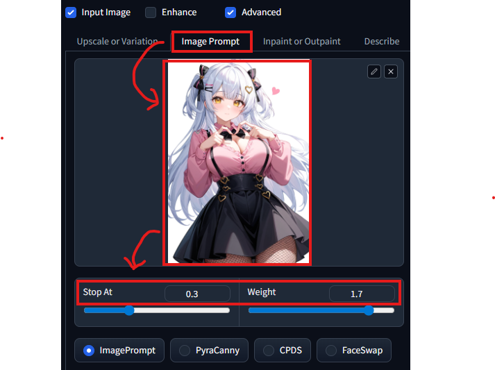 Image Prompt 탭에서 이미지 프롬프트로 사용할 이미지를 추가할 수 있으며, Stop At 값고 Weight 값을 조정 할 수 있어요.