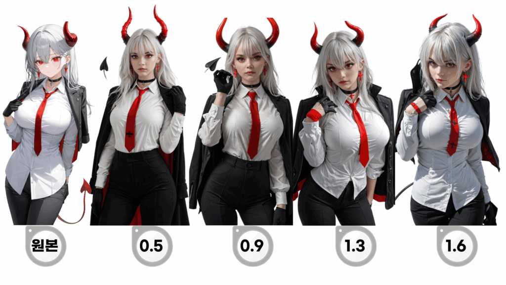 순서대로 Weight 값을 0.5, 0.9, 1.3, 1.6으로 설정하고 생성한 결과인데 함께 살펴봐요~
