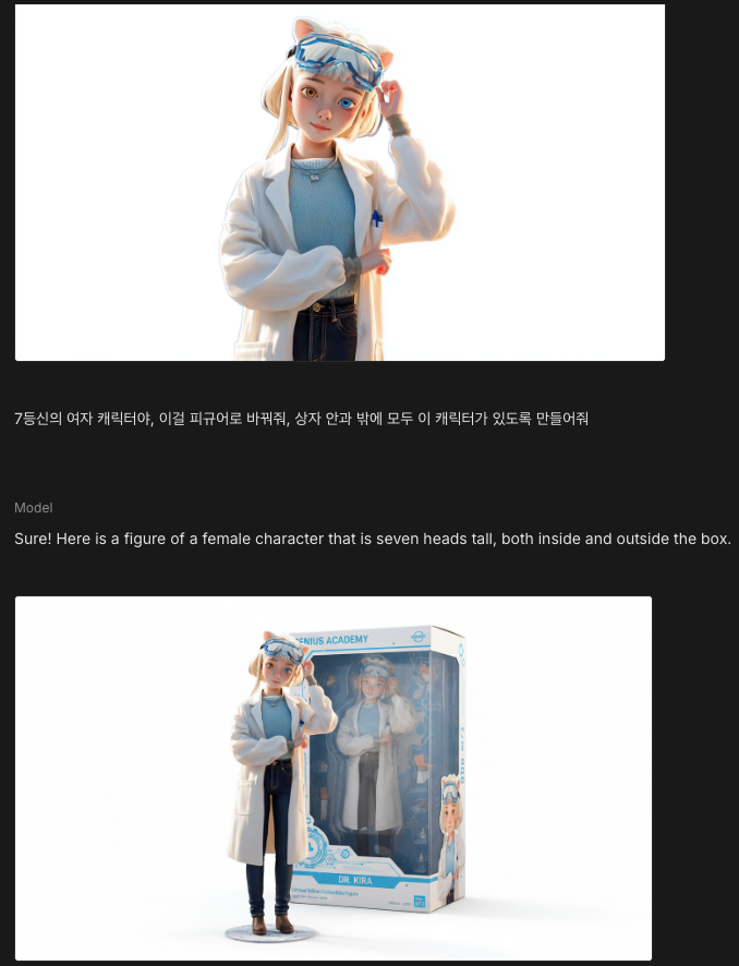 7등신의 여자 캐릭터야, 이걸 피규어로 바꿔줘, 상자 안과 밖에 모두 이 캐릭터가 있도록 만들어줘