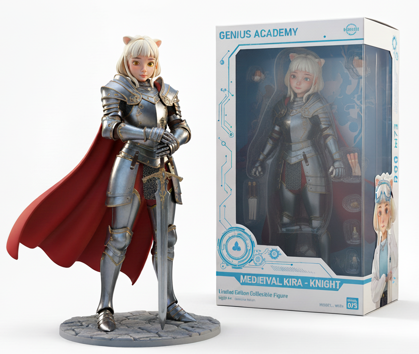 중세기사 피규어를 만들어줘, 상자 안과 밖에 모두 이 캐릭터가 있도록 만들어줘